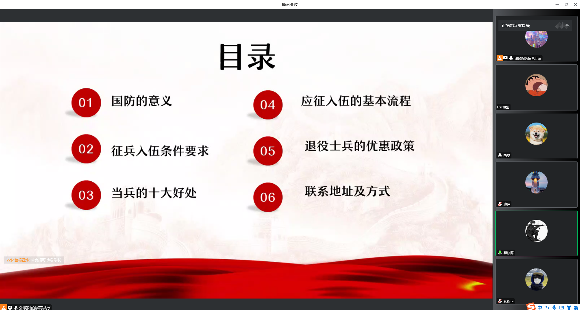 “参军尽义务,戍边卫国防”。为积极响应国家征兵号召,切实做好2023年春季征兵工作,营造浓厚的征兵工作氛围。2022年12月30日上午,beats365官网入口召开2023年征兵线上动员会。公司党总支书记曹迪伟出席会议。会议由陈圣老师主持。