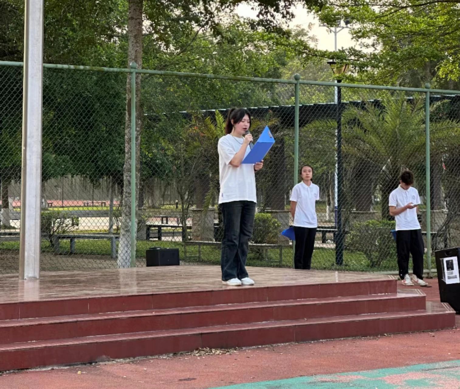 早上7点30,在全体师生的注目礼下,国旗护卫队队员们护送鲜艳的五星红旗进场,行礼完毕,伴随着庄严的《中华人民共和国国歌》,五星红旗冉冉升起,迎风飘扬。在场的每一名同学向国旗行注目礼,深怀对祖国无限的热爱和崇高的敬意。